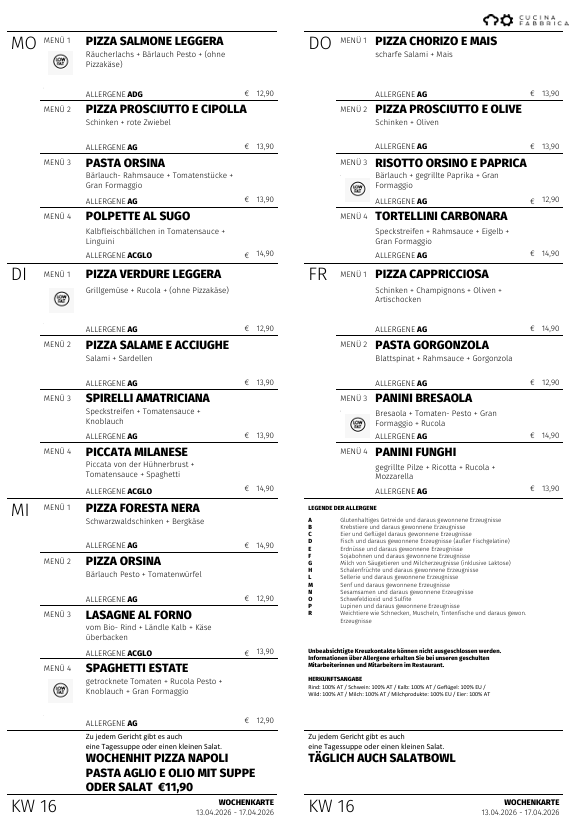 Wir legen großen Wert darauf, dass unser Angebot vielfältig und den Saisonen angepasst ist. Aus diesem Grund gibt es jede Woche eine neue Mittagskarte, und alle drei Wochen eine neue Abendkarte. Unser Lasagne-Mittwoch ist mittlerweile zu einer Tradition geworden, die von unseren Gästen sehr geschätzt wird. In der Cucina Fabbrica wird leidenschaftlich gerne gekocht, und das schmeckt man.