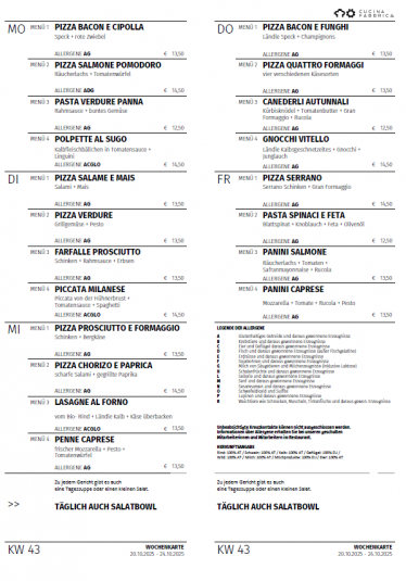 Wir legen großen Wert darauf, dass unser Angebot vielfältig und den Saisonen angepasst ist. Aus diesem Grund gibt es jede Woche eine neue Mittagskarte, und alle drei Wochen eine neue Abendkarte. Unser Lasagne-Mittwoch ist mittlerweile zu einer Tradition geworden, die von unseren Gästen sehr geschätzt wird. In der Cucina Fabbrica wird leidenschaftlich gerne gekocht, und das schmeckt man.