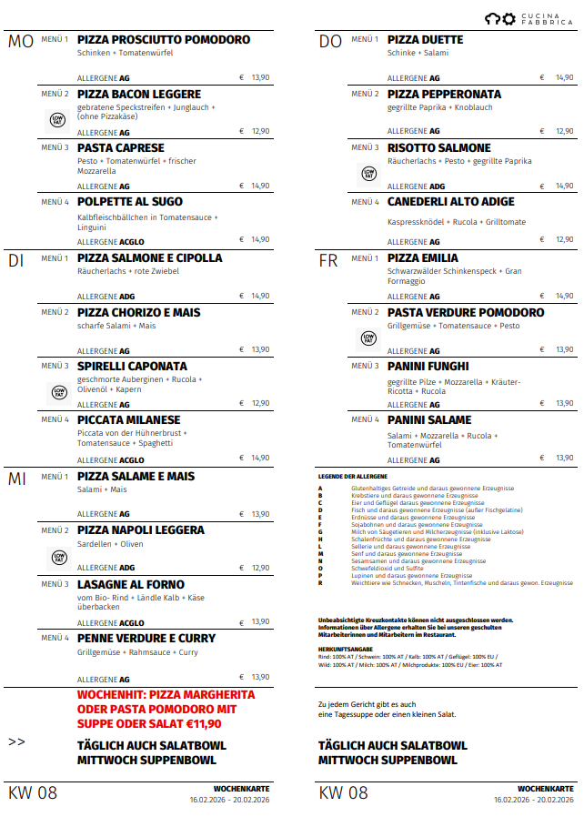 Wir legen großen Wert darauf, dass unser Angebot vielfältig und den Saisonen angepasst ist. Aus diesem Grund gibt es jede Woche eine neue Mittagskarte, und alle drei Wochen eine neue Abendkarte. Unser Lasagne-Mittwoch ist mittlerweile zu einer Tradition geworden, die von unseren Gästen sehr geschätzt wird. In der Cucina Fabbrica wird leidenschaftlich gerne gekocht, und das schmeckt man.