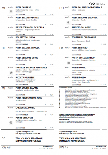Wir legen großen Wert darauf, dass unser Angebot vielfältig und den Saisonen angepasst ist. Aus diesem Grund gibt es jede Woche eine neue Mittagskarte, und alle drei Wochen eine neue Abendkarte. Unser Lasagne-Mittwoch ist mittlerweile zu einer Tradition geworden, die von unseren Gästen sehr geschätzt wird. In der Cucina Fabbrica wird leidenschaftlich gerne gekocht, und das schmeckt man.