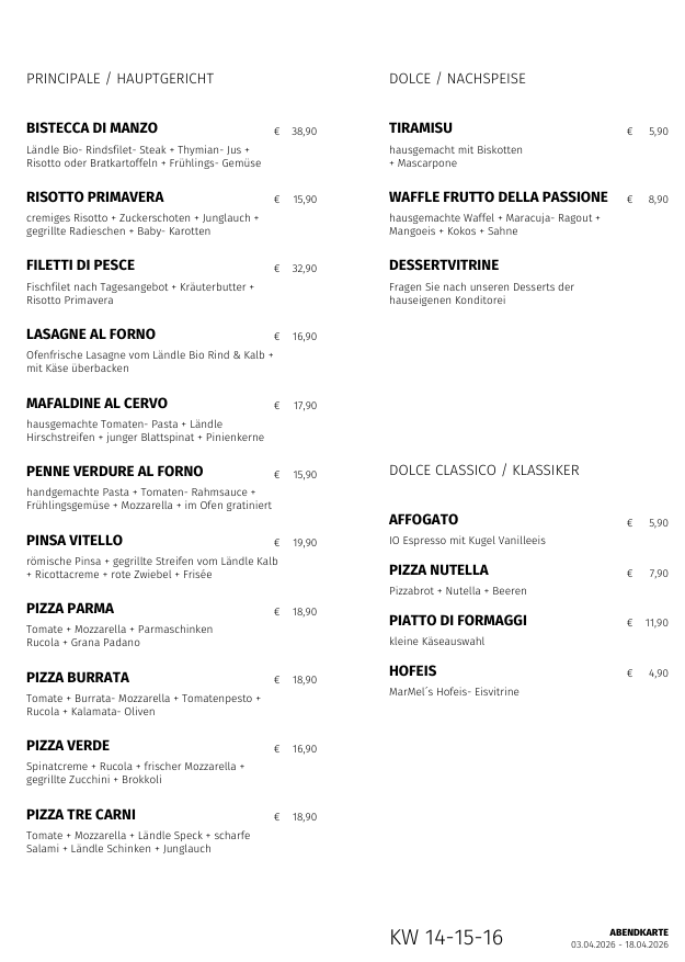 Wir legen großen Wert darauf, dass unser Angebot vielfältig und den Saisonen angepasst ist. Aus diesem Grund gibt es jede Woche eine neue Mittagskarte, und alle drei Wochen eine neue Abendkarte. Unser Lasagne-Mittwoch ist mittlerweile zu einer Tradition geworden, die von unseren Gästen sehr geschätzt wird. In der Cucina Fabbrica wird leidenschaftlich gerne gekocht, und das schmeckt man.