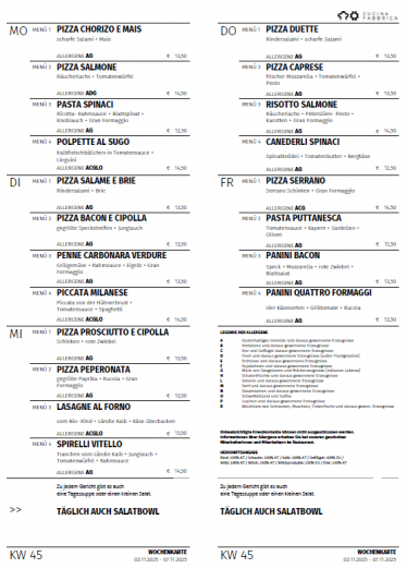 Wir legen großen Wert darauf, dass unser Angebot vielfältig und den Saisonen angepasst ist. Aus diesem Grund gibt es jede Woche eine neue Mittagskarte, und alle drei Wochen eine neue Abendkarte. Unser Lasagne-Mittwoch ist mittlerweile zu einer Tradition geworden, die von unseren Gästen sehr geschätzt wird. In der Cucina Fabbrica wird leidenschaftlich gerne gekocht, und das schmeckt man.