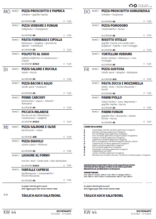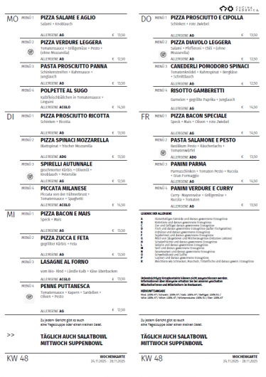 Wir legen großen Wert darauf, dass unser Angebot vielfältig und den Saisonen angepasst ist. Aus diesem Grund gibt es jede Woche eine neue Mittagskarte, und alle drei Wochen eine neue Abendkarte. Unser Lasagne-Mittwoch ist mittlerweile zu einer Tradition geworden, die von unseren Gästen sehr geschätzt wird. In der Cucina Fabbrica wird leidenschaftlich gerne gekocht, und das schmeckt man.