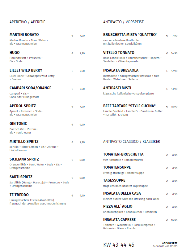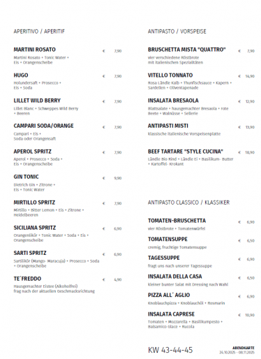 Wir legen großen Wert darauf, dass unser Angebot vielfältig und den Saisonen angepasst ist. Aus diesem Grund gibt es jede Woche eine neue Mittagskarte, und alle drei Wochen eine neue Abendkarte. Unser Lasagne-Mittwoch ist mittlerweile zu einer Tradition geworden, die von unseren Gästen sehr geschätzt wird. In der Cucina Fabbrica wird leidenschaftlich gerne gekocht, und das schmeckt man.