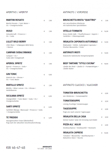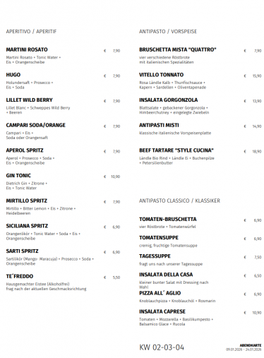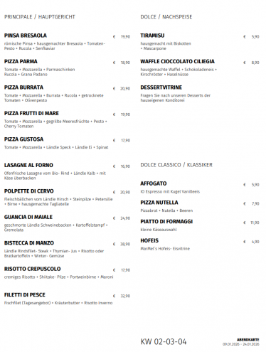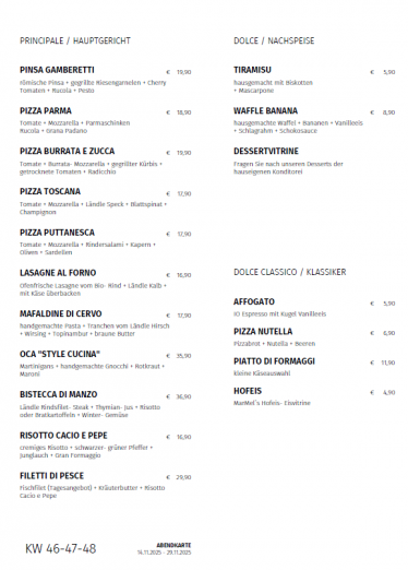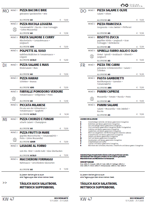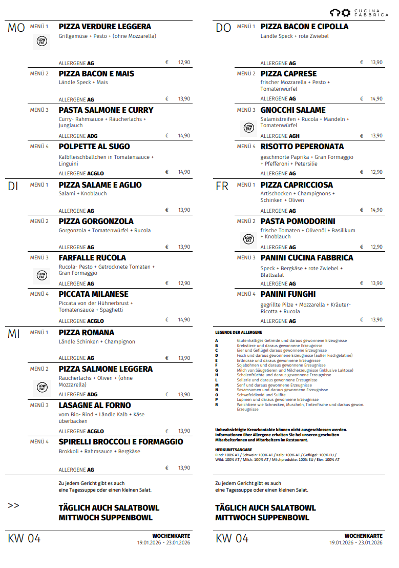 Wir legen großen Wert darauf, dass unser Angebot vielfältig und den Saisonen angepasst ist. Aus diesem Grund gibt es jede Woche eine neue Mittagskarte, und alle drei Wochen eine neue Abendkarte. Unser Lasagne-Mittwoch ist mittlerweile zu einer Tradition geworden, die von unseren Gästen sehr geschätzt wird. In der Cucina Fabbrica wird leidenschaftlich gerne gekocht, und das schmeckt man.